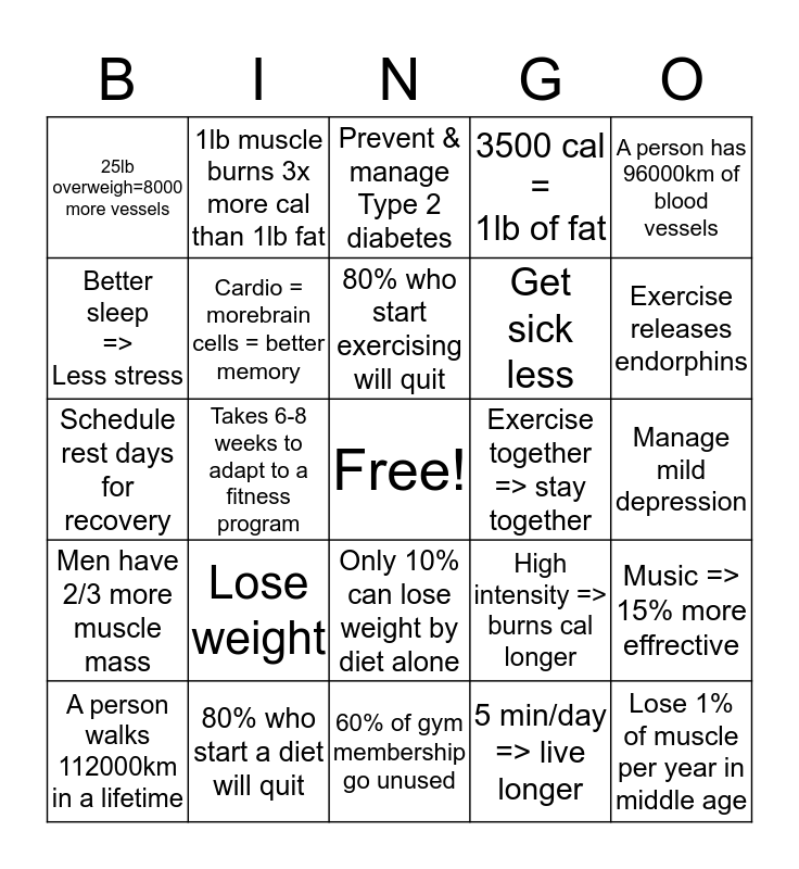 This bingo card has a free space and 24 words: Lose weight, 80% who start a diet will quit, 80% who start exercising will quit, A person walks 112000km in a lifetime, A person has 96000km of blood vessels, 25lb overweigh=8000 more vessels, Better sleep => Less stress, 1lb muscle burns 3x more cal than 1lb fat, Exercise together => stay together, Only 10% can lose weight by diet alone, Get sick less, Schedule rest days for recovery, High intensity => burns cal longer, Music => 15% more effrective, Cardio = morebrain cells = better memory, 5 min/day => live longer, Manage mild depression, Prevent & manage Type 2 diabetes, Exercise releases endorphins, Takes 6-8 weeks to adapt to a fitness program, Lose 1% of muscle per year in middle age, Men have 2/3 more muscle mass, 3500 cal = 1lb of fat and 60% of gym membership go unused.