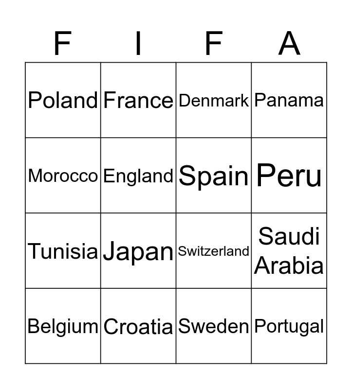 This bingo card has 32 words: Russia, Egypt, Saudi Arabia, Uruguay, Portugal, Spain, Morocco, IR Iran, France, Australia, Peru, Denmark, Argentina, Iceland, Croatia, Nigeria, Brazil, Switzerland, Costa Rica, Serbia, Germany, Mexico, Sweden, Korea Republic, Belgium, Panama, Tunisia, England, Poland, Senegal, Colombia and Japan.