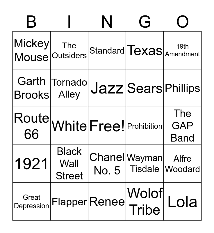 This bingo card has a free space and 24 words: Black Wall Street, Flapper, Jazz, Great Depression, 19th Amendment, Mickey Mouse, Garth Brooks, The Outsiders, Prohibition, Chanel No. 5, Sears, Route 66, Wayman Tisdale, Alfre Woodard, Tornado Alley, Wolof Tribe, The GAP Band, Standard, Phillips, White, Lola, 1921, Texas and Renee.