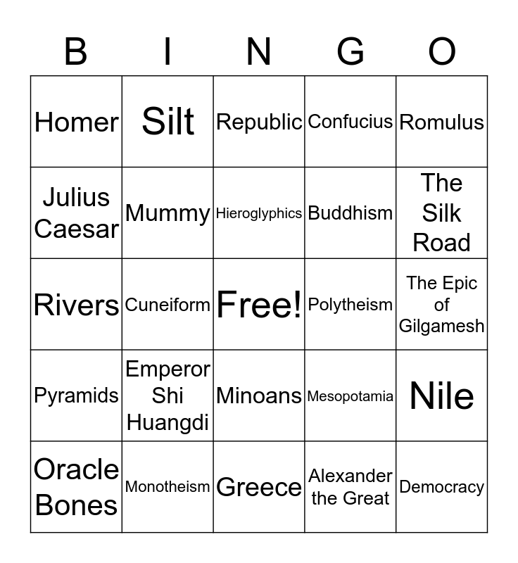 This bingo card has a free space and 24 words: Emperor Shi Huangdi, Monotheism, Hieroglyphics, Oracle Bones, Romulus, Homer, Julius Caesar, Silt, Polytheism, Minoans, Buddhism, Rivers, Mesopotamia, Nile, Mummy, Alexander the Great, The Epic of Gilgamesh, Republic, The Silk Road, Cuneiform, Democracy, Pyramids, Confucius and Greece.