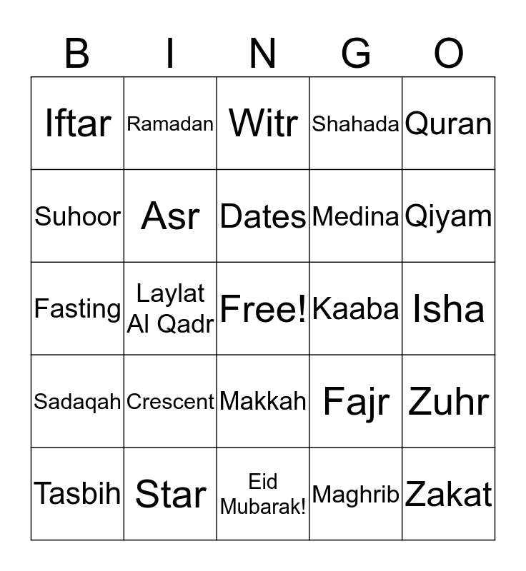 This bingo card has a free space and 24 words: Crescent, Star, Dates, Tasbih, Quran, Iftar, Suhoor, Ramadan, Kaaba, Makkah, Medina, Fasting, Fajr, Zuhr, Asr, Maghrib, Isha, Witr, Qiyam, Laylat Al Qadr, Zakat, Sadaqah, Shahada and Eid Mubarak!.