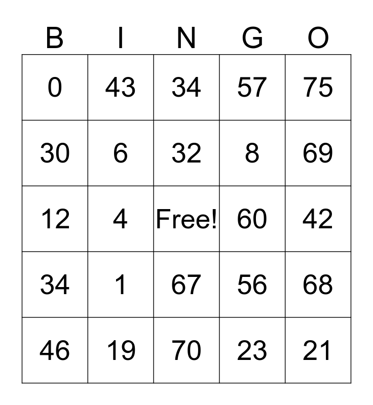 This bingo card has a free space and 24 words: 1, 19, 32, 46, 75, 0, 30, 43, 60, 67, 8, 12, 56, 68, 6, 23, 42, 34, 69, 4, 21, 34, 57 and 70.