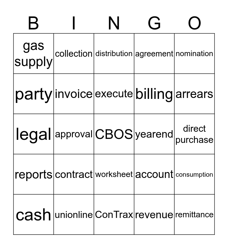 This bingo card has a free space and 24 words: contract, unionline, execute, cash, nomination, gas supply, party, collection, yearend, worksheet, billing, legal, account, consumption, invoice, revenue, direct purchase, distribution, arrears, approval, remittance, reports, agreement and ConTrax.