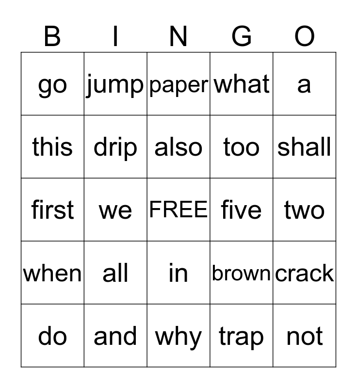 This bingo card has a free space and 24 words: all, and, also, do, a, go, this, jump, five, in, too, first, brown, crack, drip, trap, two, paper, shall, we, not, when, what and why.