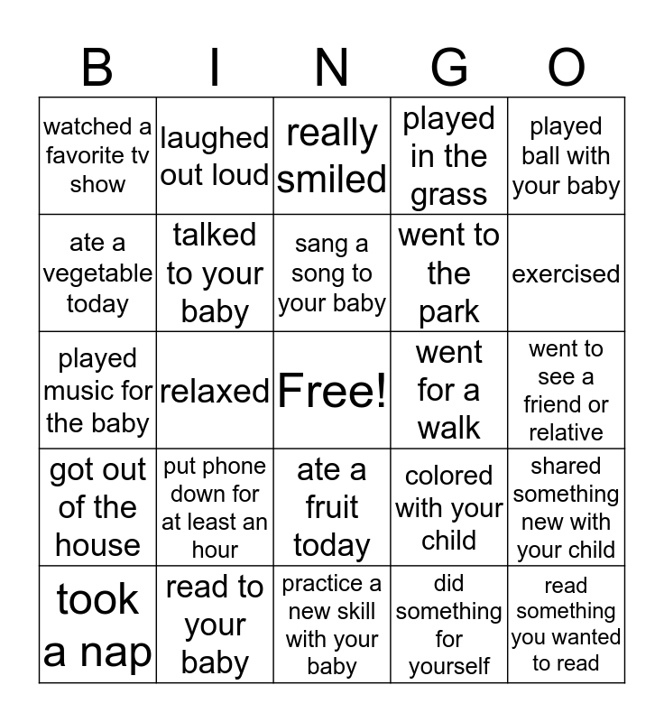 This bingo card has a free space and 24 words: put phone down for at least an hour, read to your baby, sang a song to your baby, took a nap, played ball with your baby, watched a favorite tv show, ate a vegetable today, laughed out loud, went for a walk, ate a fruit today, went to the park, played music for the baby, colored with your child, shared something new with your child, talked to your baby, did something for yourself, went to see a friend or relative, really smiled, exercised, relaxed, read something you wanted to read, got out of the house, played in the grass and practice a new skill with your baby.
