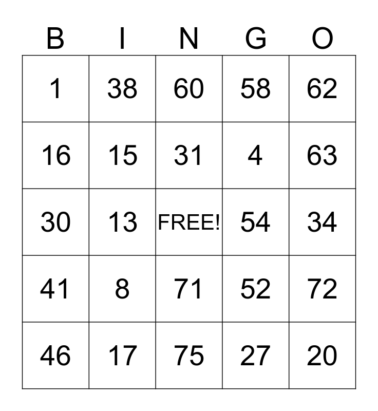 This bingo card has a free space and 24 words: 8, 17, 31, 46, 62, 1, 16, 38, 54, 71, 4, 30, 52, 72, 15, 27, 34, 60, 63, 13, 20, 41, 58 and 75.