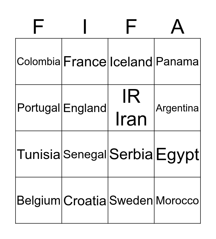 This bingo card has 32 words: Russia, Saudi Arabia, Egypt, Uruguay, Morocco, IR Iran, Portugal, Spain, France, Australia, Argentina, Iceland, Peru, Denmark, Croatia, Nigeria, Costa Rica, Serbia, Germany, Mexico, Brazil, Switzerland, Sweden, Korea Republic, Belgium, Panama, Tunisia, England, Colombia, Japan, Poland and Senegal.