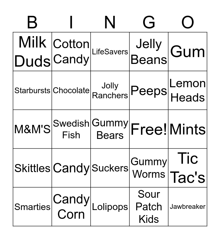 This bingo card has a free space and 24 words: Smarties, Candy, Jolly Ranchers, Sour Patch Kids, Gum, Milk Duds, Cotton Candy, LifeSavers, Free!, Mints, M&M'S, Chocolate, Gummy Worms, Tic Tac's, Starbursts, Candy Corn, Lolipops, Jelly Beans, Lemon Heads, Skittles, Swedish Fish, Suckers, Peeps and Jawbreaker.