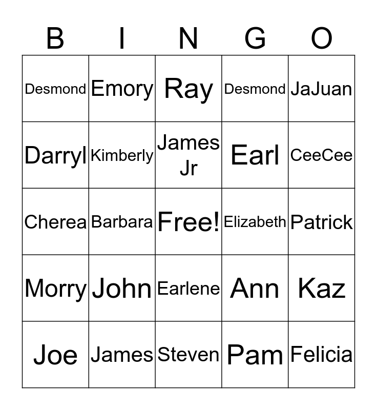 This bingo card has a free space and 24 words: John, James, James Jr, Joe, JaJuan, Desmond, Darryl, Emory, Elizabeth, Earlene, Earl, Cherea, Ann, Kaz, Kimberly, Pam, Patrick, Ray, CeeCee, Barbara, Felicia, Morry, Desmond and Steven.