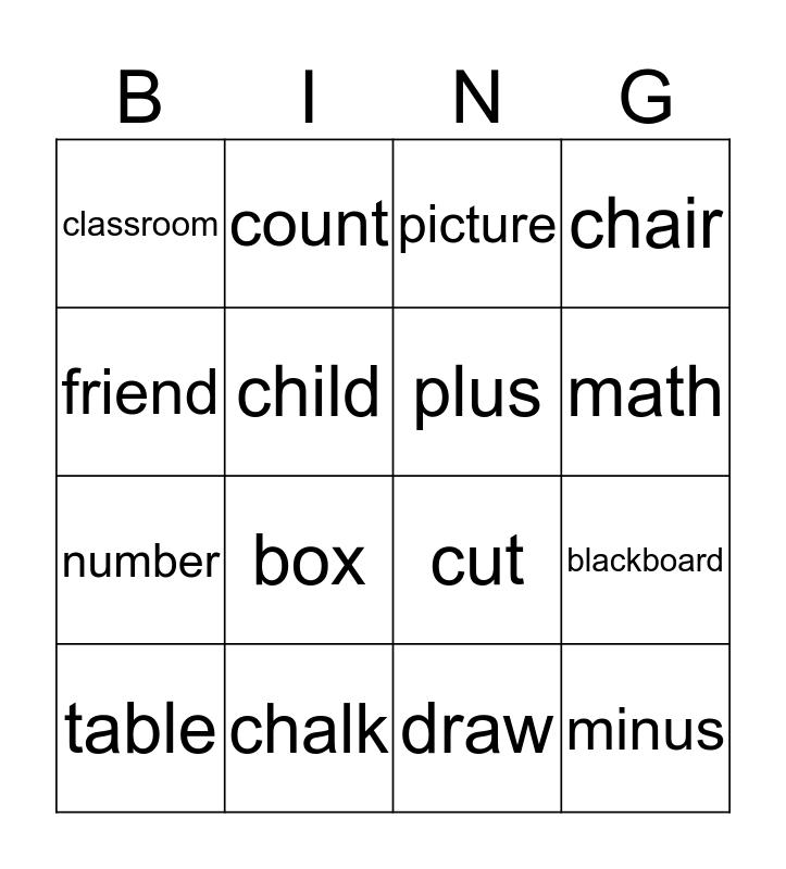 This bingo card has 16 words: chalk, blackboard, picture, classroom, number, count, cut, draw, friend, child, table, chair, box, math, plus and minus.