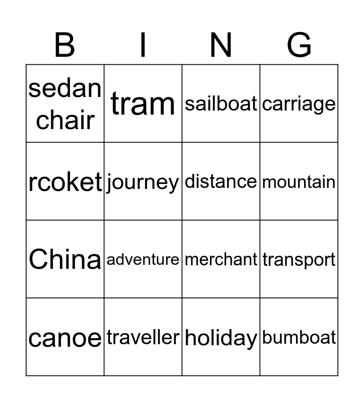 This bingo card has 16 words: traveller, transport, sailboat, sedan chair, China, tram, merchant, holiday, rcoket, journey, canoe, carriage, adventure, mountain, distance and bumboat.