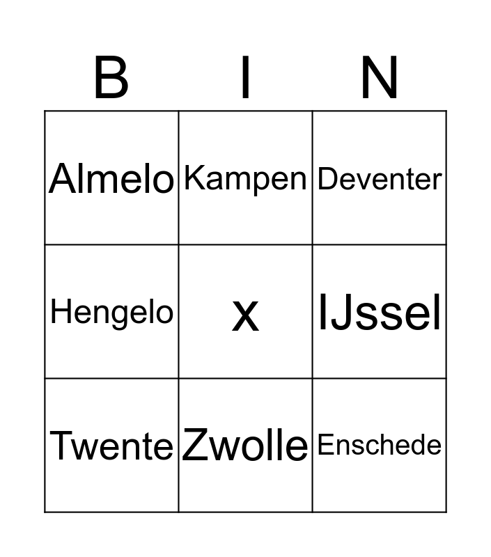 This bingo card has a free space and 10 words: Zwolle, Deventer, Almelo, Enschede, Hengelo, Twente, Kampen, Sallands Heuvelrug, IJssel and Overijssel.