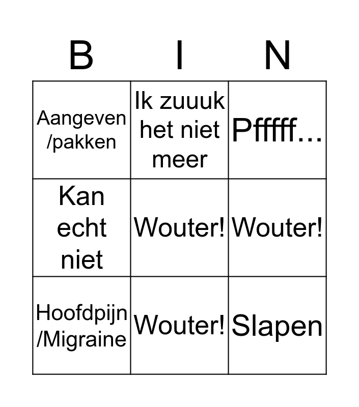 This bingo card has a free space and 8 words: Wouter!, Pfffff..., Ik zuuuk het niet meer, Hoofdpijn /Migraine, Aangeven /pakken, Slapen, Kan echt niet and Wouter!.