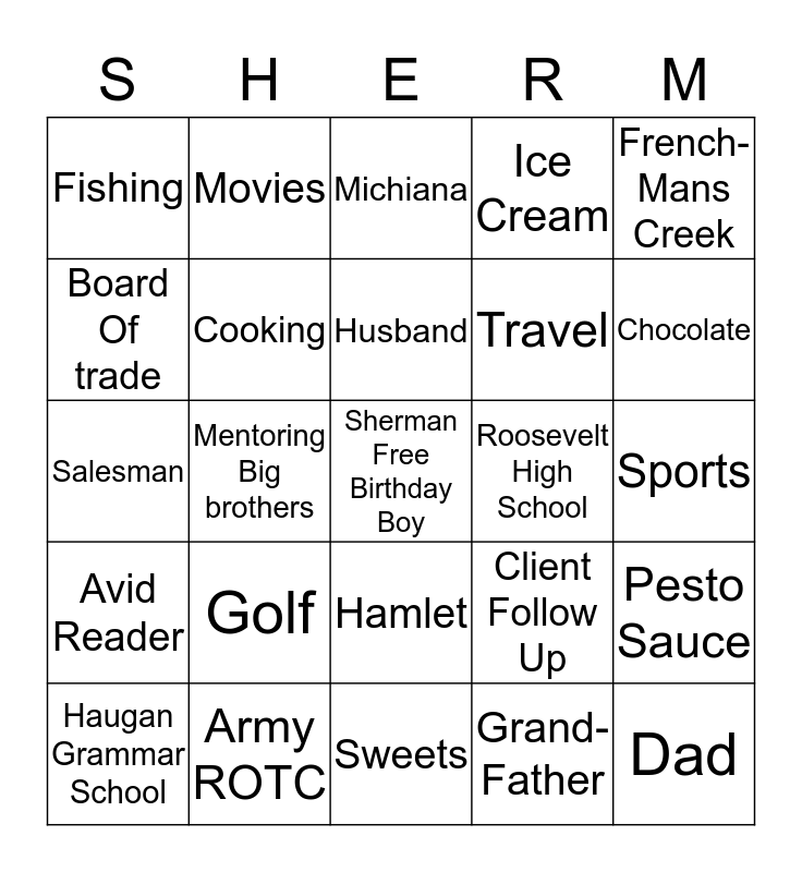 This bingo card has a free space and 24 words: Golf, Army ROTC, Husband, Haugan Grammar School, French- Mans Creek, Fishing, Board Of trade, Movies, Roosevelt High School, Hamlet, Travel, Salesman, Client Follow Up, Pesto Sauce, Cooking, Grand- Father, Sports, Michiana, Chocolate, Mentoring Big brothers, Dad, Avid Reader, Ice Cream and Sweets.