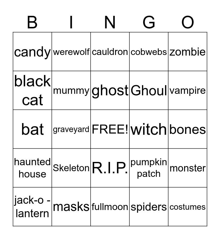 This bingo card has a free space and 24 words: Skeleton, masks, ghost, jack-o -lantern, zombie, candy, black cat, werewolf, witch, R.I.P., Ghoul, bat, pumpkin patch, monster, mummy, spiders, bones, cauldron, vampire, graveyard, costumes, haunted house, cobwebs and fullmoon.