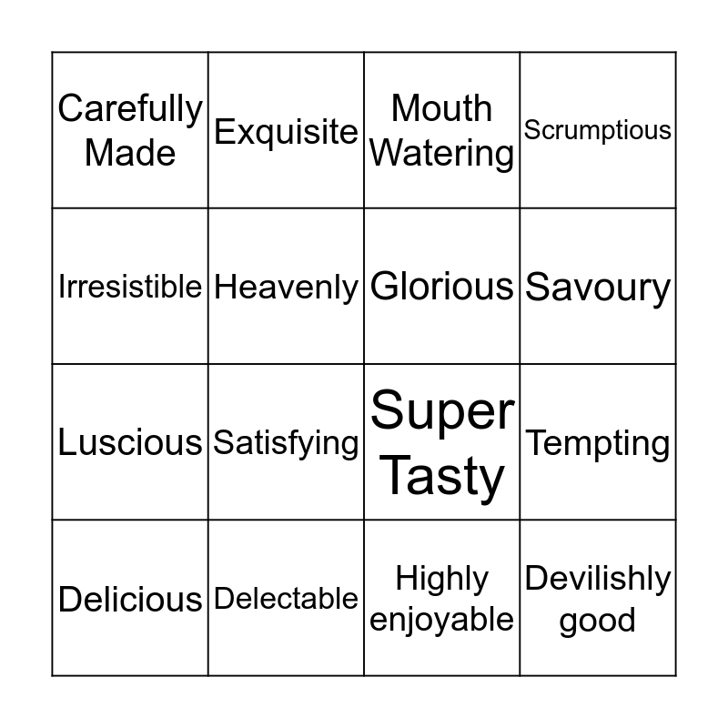 This bingo card has 17 words: Delicious, Delectable, Mouth Watering, Scrumptious, Luscious, Heavenly, Super Tasty, Savoury, Irresistible, Satisfying, Highly enjoyable, Tempting, Carefully Made, Exquisite, Glorious, Devilishly good and Yummy.