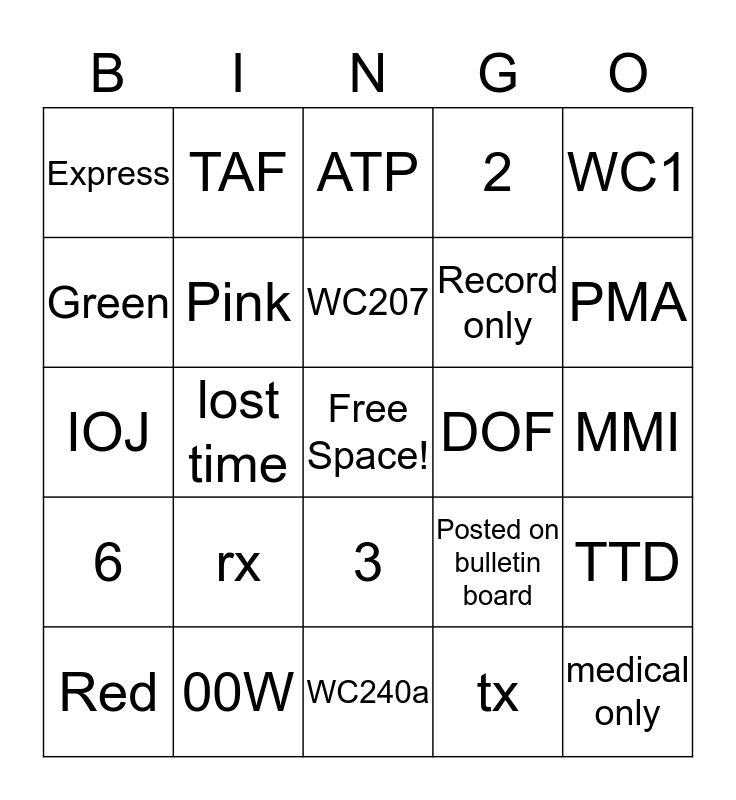 This bingo card has a free space and 24 words: rx, 00W, WC207, Red, WC1, Express, Green, TAF, DOF, 3, Record only, IOJ, Posted on bulletin board, TTD, Pink, tx, MMI, ATP, PMA, lost time, medical only, 6, 2 and WC240a.