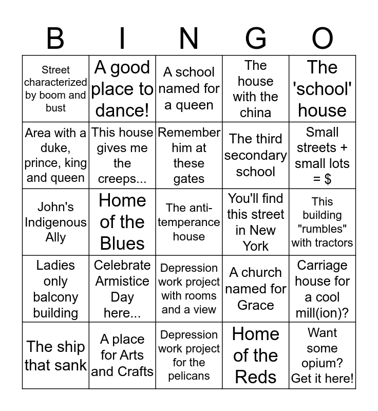 This bingo card has 30 words: A place for Arts and Crafts, My caretaker makes Mr. Denie seem like Santa Clause, Home of the Blues, Hockey night in Canada in Saskatoon, Street characterized by boom and bust, A school named for a queen, This house gives me the creeps..., Depression work project with rooms and a view, You'll find this street in New York, Depression work project for the pelicans, This building "rumbles" with tractors, The anti-temperance house, Home of the Reds, Want some opium? Get it here!, Small streets + small lots = $, A place to buy your 'hockey sweater', A church named for Grace, Ladies only balcony building, Celebrate Armistice Day here..., The 'school' house, John's Indigenous Ally, A 'temperance' man, A good place to dance!, The third secondary school, Area with a duke, prince, king and queen, The house with the china, Carriage house for a cool mill(ion)?, The ship that sank, Remember him at these gates and Does this water smell funny?.