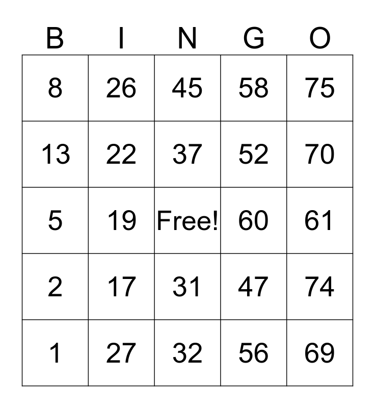 This bingo card has a free space and 24 words: 1, 17, 37, 56, 75, 8, 26, 45, 60, 61, 5, 22, 47, 74, 13, 27, 32, 58, 70, 2, 19, 31, 52 and 69.