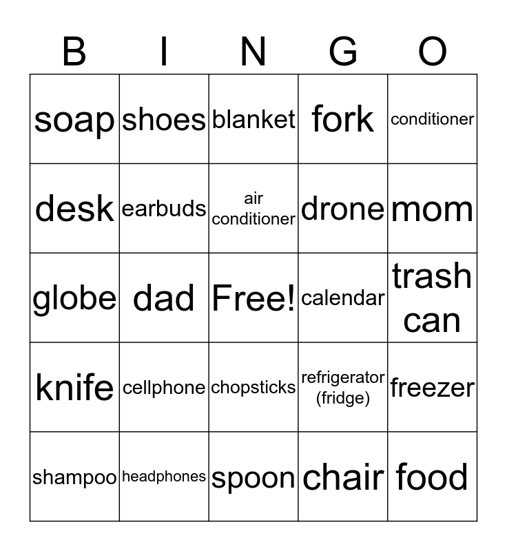 This bingo card has a free space and 24 words: cellphone, headphones, air conditioner, shampoo, conditioner, soap, desk, shoes, calendar, chopsticks, drone, globe, refrigerator (fridge), freezer, earbuds, chair, trash can, blanket, mom, dad, food, knife, fork and spoon.