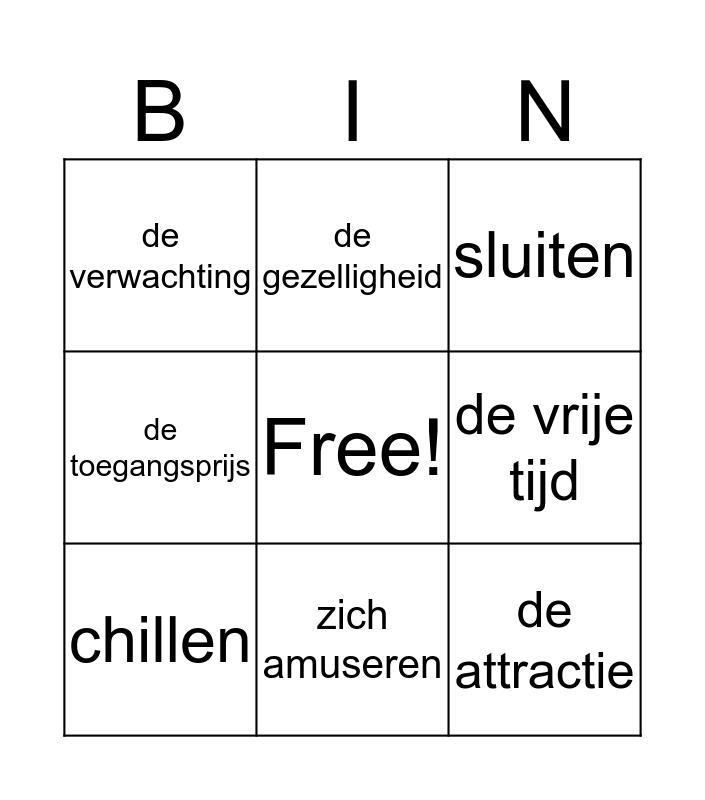 This bingo card has a free space and 11 words: actief, zich amuseren, de attractie, chillen, de gezelligheid, sluiten, de vrije tijd, een toegangsbewijs, de toegangsprijs, de verwachting and verzamelen.