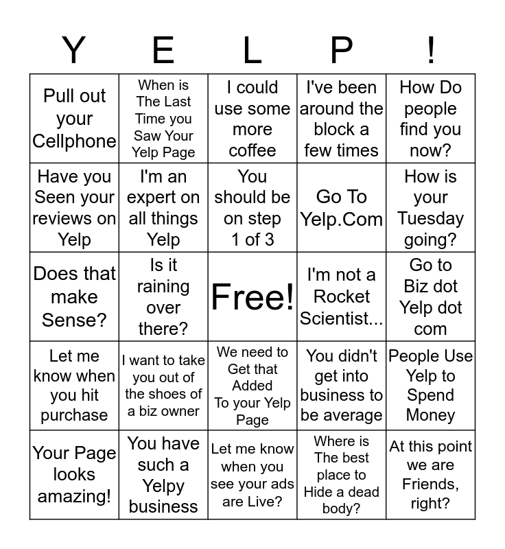 This bingo card has a free space and 24 words: I want to take you out of the shoes of a biz owner, You have such a Yelpy business, You should be on step 1 of 3, Your Page looks amazing!, How Do people find you now?, Pull out your Cellphone, Have you Seen your reviews on Yelp, When is The Last Time you Saw Your Yelp Page, I'm not a Rocket Scientist..., We need to Get that Added To your Yelp Page, Go To Yelp.Com, Does that make Sense?, You didn't get into business to be average, People Use Yelp to Spend Money, I'm an expert on all things Yelp, Where is The best place to Hide a dead body?, Go to Biz dot Yelp dot com, I could use some more coffee, How is your Tuesday going?, Is it raining over there?, At this point we are Friends, right?, Let me know when you hit purchase, I've been around the block a few times and Let me know when you see your ads are Live?.