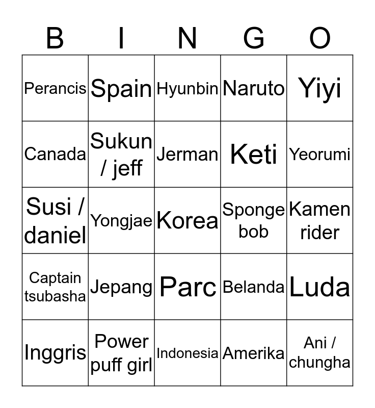 This bingo card has 25 words: Jepang, Indonesia, Jerman, Inggris, Yiyi, Perancis, Canada, Spain, Sponge bob, Parc, Keti, Susi / daniel, Belanda, Luda, Sukun / jeff, Ani / chungha, Kamen rider, Hyunbin, Yeorumi, Yongjae, Korea, Power puff girl, Captain tsubasha, Naruto and Amerika.