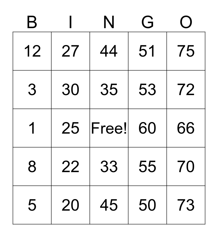 This bingo card has a free space and 24 words: 5, 22, 35, 50, 75, 12, 27, 44, 60, 66, 1, 30, 55, 70, 3, 20, 45, 51, 72, 8, 25, 33, 53 and 73.