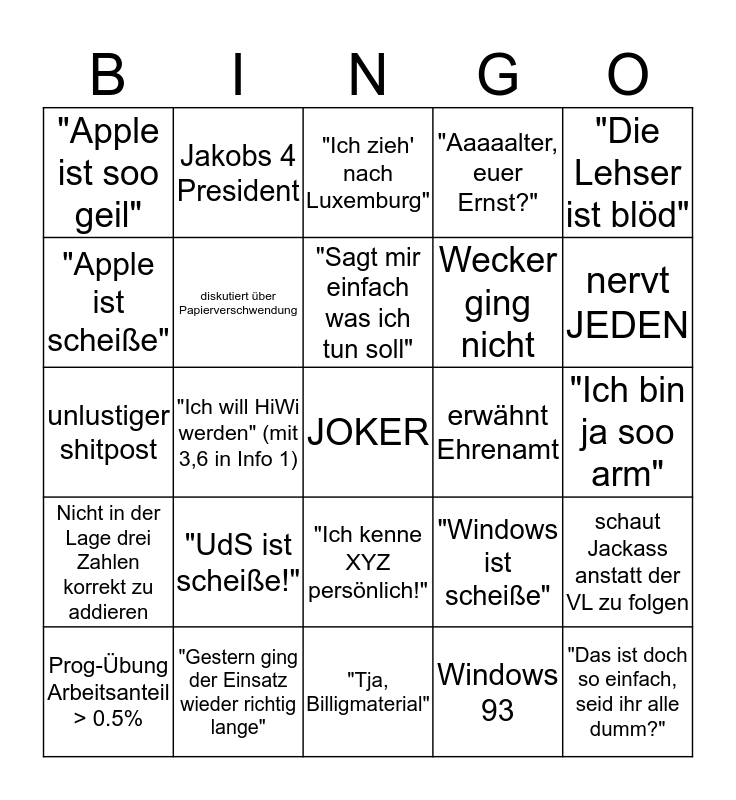 This bingo card has a free space and 24 words: "UdS ist scheiße!", "Gestern ging der Einsatz wieder richtig lange", "Sagt mir einfach was ich tun soll", Prog-Übung Arbeitsanteil > 0.5%, "Die Lehser ist blöd", "Apple ist soo geil", "Apple ist scheiße", Jakobs 4 President, erwähnt Ehrenamt, "Ich kenne XYZ persönlich!", Wecker ging nicht, unlustiger shitpost, "Windows ist scheiße", schaut Jackass anstatt der VL zu folgen, diskutiert über Papierverschwendung, Windows 93, "Ich bin ja soo arm", "Ich zieh' nach Luxemburg", nervt JEDEN, "Ich will HiWi werden" (mit 3,6 in Info 1), "Das ist doch so einfach, seid ihr alle dumm?", Nicht in der Lage drei Zahlen korrekt zu addieren, "Aaaaalter, euer Ernst?" and "Tja, Billigmaterial".
