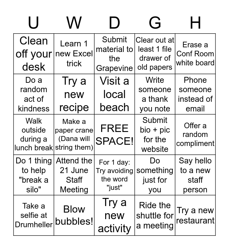 This bingo card has a free space and 24 words: Attend the 21 June Staff Meeting, Blow bubbles!, Visit a local beach, Take a selfie at Drumheller, Erase a Conf Room white board, Clean off your desk, Do a random act of kindness, Learn 1 new Excel trick, Submit bio + pic for the website, For 1 day: Try avoiding the word "just", Write someone a thank you note, Walk outside during a lunch break, Do something just for you, Say hello to a new staff person, Try a new recipe, Ride the shuttle for a meeting, Offer a random compliment, Submit material to the Grapevine, Phone someone instead of email, Make a paper crane (Dana will string them), Try a new restaurant, Do 1 thing to help "break a silo", Clear out at least 1 file drawer of old papers and Try a new activity.