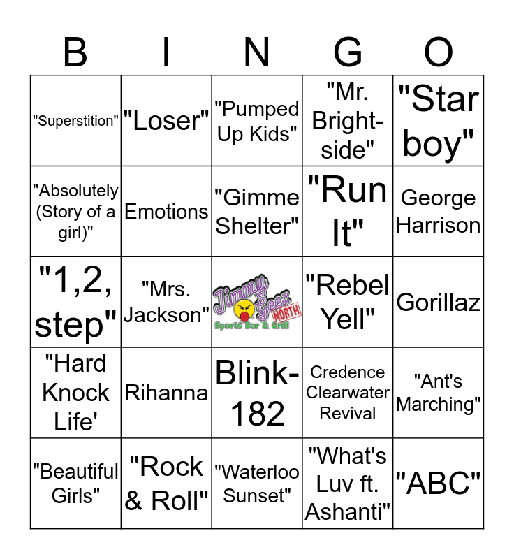 This bingo card has a free space and 24 words: Rihanna, "Rock & Roll", "Gimme Shelter", "Beautiful Girls", "Star boy", "Superstition", "Absolutely (Story of a girl)", "Loser", "Rebel Yell", Blink-182, "Run It", "1,2, step", Credence Clearwater Revival, "Ant's Marching", Emotions, "What's Luv ft. Ashanti", Gorillaz, "Pumped Up Kids", George Harrison, "Mrs. Jackson", "ABC", "Hard Knock Life', "Mr. Bright-side" and "Waterloo Sunset".