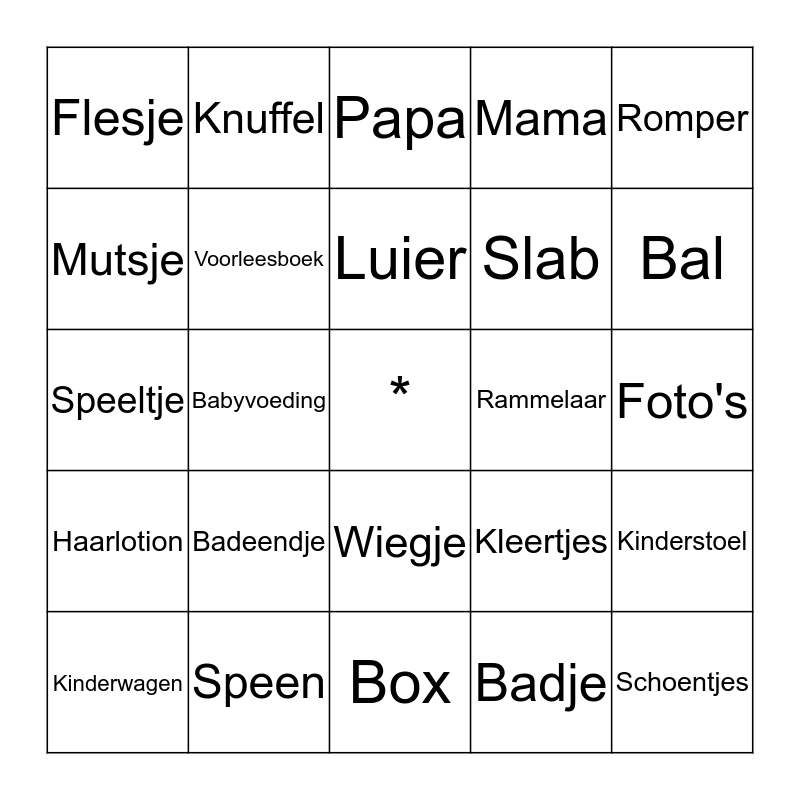 This bingo card has a free space and 24 words: Badeendje, Speen, Luier, Kinderwagen, Romper, Flesje, Mutsje, Knuffel, Rammelaar, Wiegje, Slab, Speeltje, Kleertjes, Kinderstoel, Voorleesboek, Badje, Foto's, Papa, Bal, Babyvoeding, Schoentjes, Haarlotion, Mama and Box.