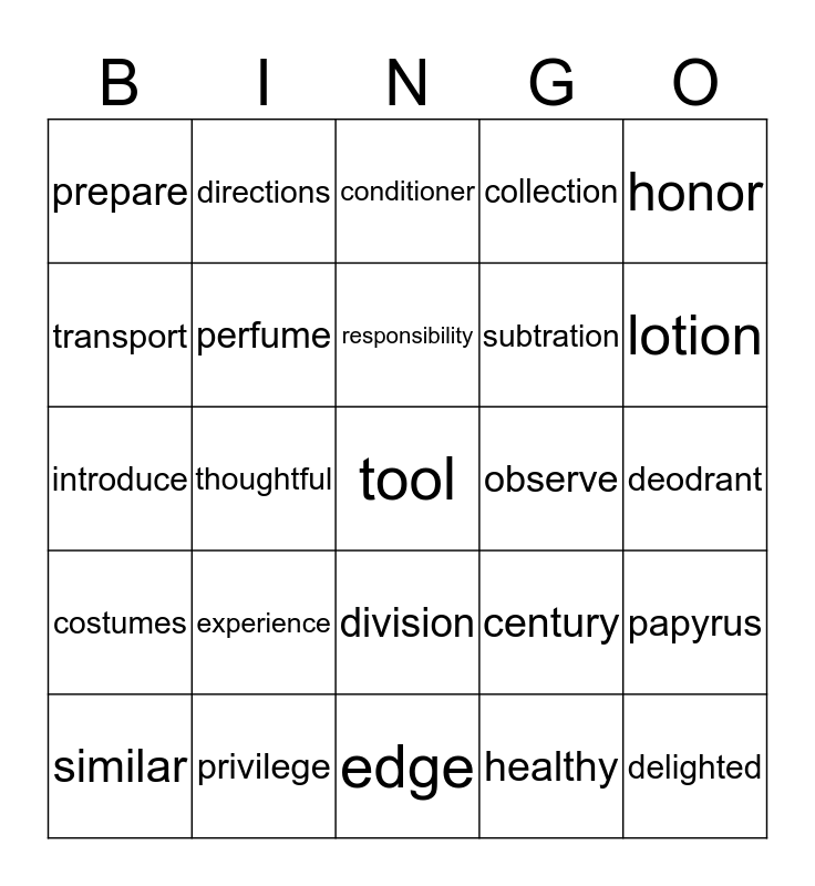 This bingo card has a free space and 24 words: experience, privilege, responsibility, similar, honor, prepare, transport, directions, observe, division, subtration, introduce, century, papyrus, perfume, healthy, deodrant, conditioner, lotion, thoughtful, delighted, costumes, collection and edge.