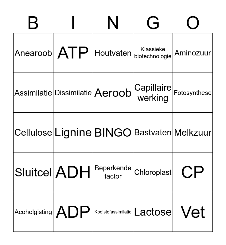 This bingo card has a free space and 24 words: ADH, ADP, Aeroob, Acoholgisting, Aminozuur, Anearoob, Assimilatie, ATP, Bastvaten, Beperkende factor, Capillaire werking, Cellulose, Chloroplast, CP, Dissimilatie, Lactose, Melkzuur, Houtvaten, Fotosynthese, Lignine, Vet, Sluitcel, Klassieke biotechnologie and Koolstofassimilatie.