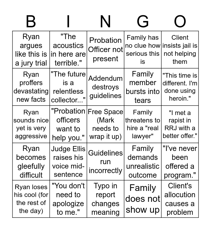 This bingo card has a free space and 24 words: Ryan loses his cool (for the rest of the day), Judge Ellis raises his voice mid-sentence, Addendum destroys guidelines, Family does not show up, Client insists jail is not helping them, Ryan argues like this is a jury trial, "The acoustics in here are terrible.", Probation Officer not present, Family threatens to hire a "real lawyer", "I met a rapist in RRJ with a better offer.", Ryan sounds nice yet is very aggressive, "The future is a relentless collector...", Family demands unrealistic outcome, "I've never been offered a program.", Ryan proffers devastating new facts, "You don't need to apologize to me.", Typo in report changes meaning, Family has no clue how serious this is, "This time is different. I'm done using heroin.", Ryan becomes gleefully difficult, "Probation officers want to help you.", Guidelines run incorrectly, Family member bursts into tears and Client's allocution causes a problem.