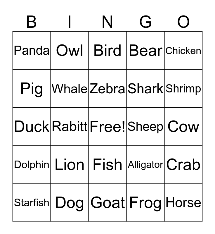 This bingo card has a free space and 27 words: Alligator, Camel, Shark, Goat, Pig, Bird, Owl, Dolphin, Sheep, Crab, Duck, Bear, Starfish, Dog, Shrimp, Turkey, Whale, Zebra, Lion, Panda, Cow, Frog, Rabitt, Horse, Fish, Chicken and Lobster.
