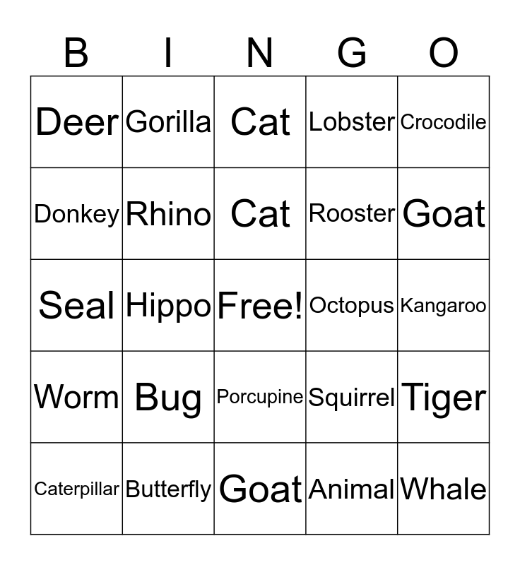 This bingo card has a free space and 24 words: Bug, Butterfly, Cat, Caterpillar, Crocodile, Deer, Donkey, Gorilla, Octopus, Porcupine, Rooster, Seal, Squirrel, Tiger, Rhino, Animal, Kangaroo, Cat, Goat, Hippo, Whale, Worm, Lobster and Goat.