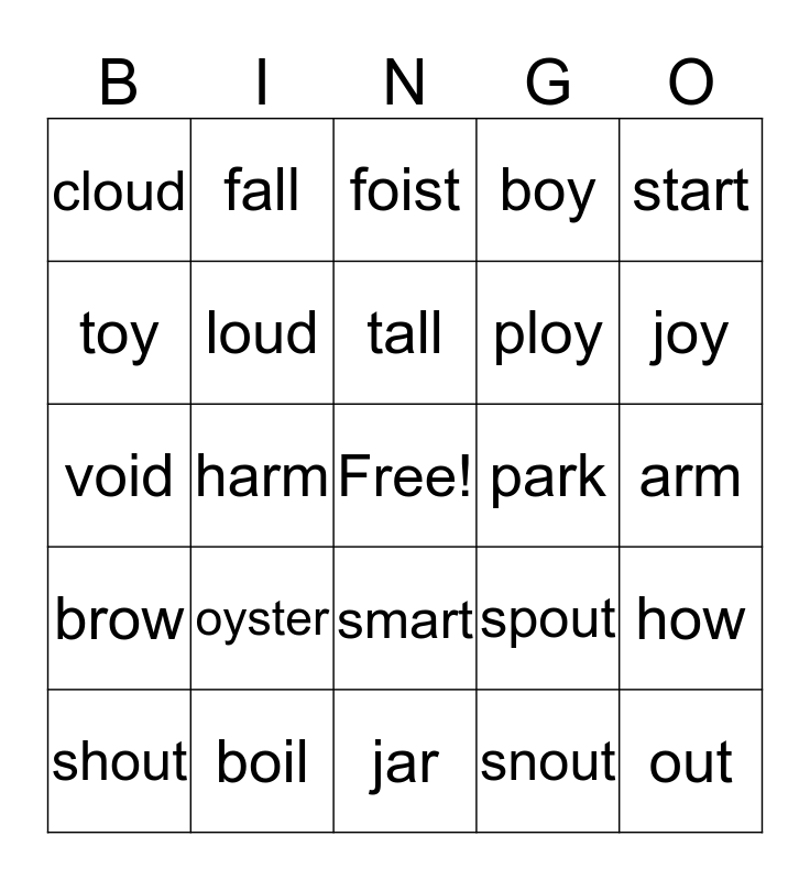 This bingo card has a free space and 24 words: oyster, boil, tall, shout, start, cloud, toy, fall, park, smart, ploy, void, spout, how, loud, snout, arm, foist, joy, harm, out, brow, boy and jar.