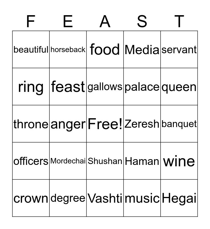 This bingo card has a free space and 24 words: Mordechai, degree, gallows, crown, servant, beautiful, ring, horseback, Zeresh, Shushan, palace, throne, Haman, wine, feast, music, banquet, food, queen, anger, Hegai, officers, Media and Vashti.