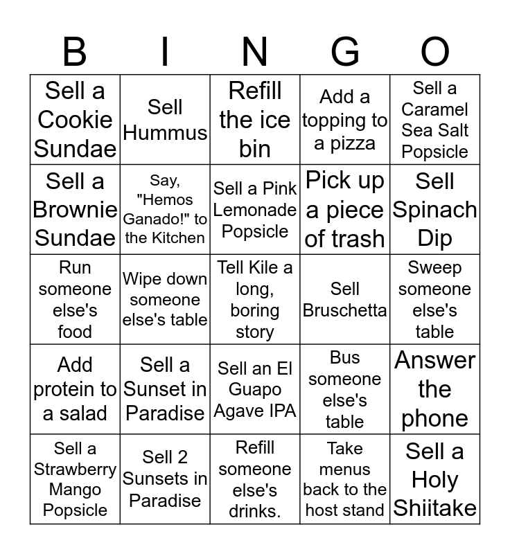This bingo card has a free space and 24 words: Sell a Sunset in Paradise, Sell 2 Sunsets in Paradise, Sell a Pink Lemonade Popsicle, Sell a Strawberry Mango Popsicle, Sell a Caramel Sea Salt Popsicle, Sell a Cookie Sundae, Sell a Brownie Sundae, Sell Hummus, Sell Bruschetta, Sell an El Guapo Agave IPA, Pick up a piece of trash, Run someone else's food, Bus someone else's table, Answer the phone, Say, "Hemos Ganado!" to the Kitchen, Take menus back to the host stand, Sweep someone else's table, Refill the ice bin, Sell Spinach Dip, Wipe down someone else's table, Sell a Holy Shiitake, Add protein to a salad, Add a topping to a pizza and Refill someone else's drinks..