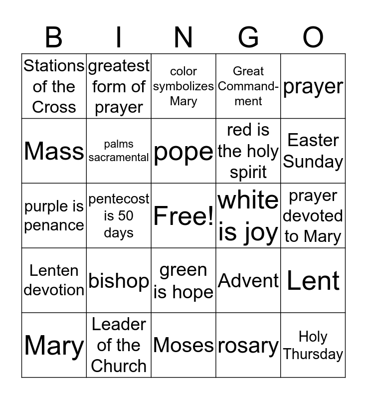 This bingo card has a free space and 24 words: bishop, Leader of the Church, pope, Mary, prayer, Stations of the Cross, Mass, greatest form of prayer, white is joy, green is hope, red is the holy spirit, purple is penance, Advent, Lent, palms sacramental, rosary, prayer devoted to Mary, color symbolizes Mary, Easter Sunday, pentecost is 50 days, Holy Thursday, Lenten devotion, Great Command-ment and Moses.