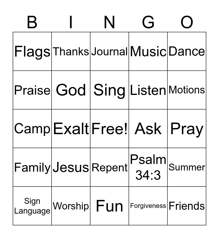 This bingo card has a free space and 24 words: Jesus, Worship, Sing, Sign Language, Dance, Flags, Praise, Thanks, Ask, Repent, Listen, Camp, Psalm 34:3, Summer, God, Forgiveness, Pray, Journal, Motions, Exalt, Friends, Family, Music and Fun.