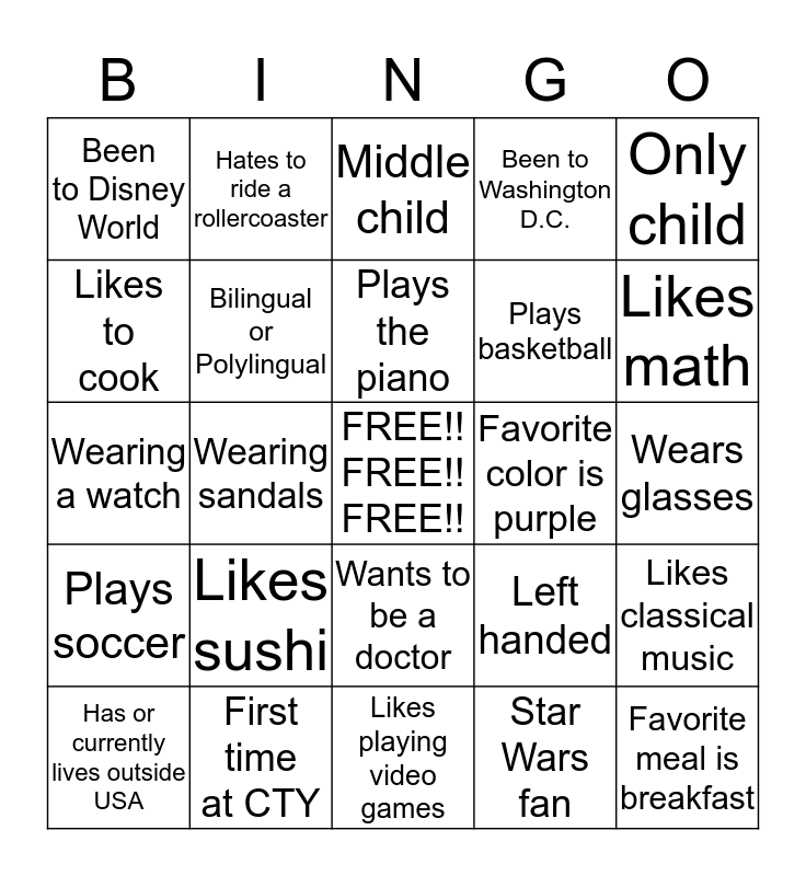 This bingo card has a free space and 24 words: Likes sushi, First time at CTY, Plays the piano, Has or currently lives outside USA, Only child, Been to Disney World, Likes to cook, Hates to ride a rollercoaster, Favorite color is purple, Wants to be a doctor, Plays basketball, Wearing a watch, Left handed, Likes classical music, Bilingual or Polylingual, Star Wars fan, Wears glasses, Middle child, Likes math, Wearing sandals, Favorite meal is breakfast, Plays soccer, Been to Washington D.C. and Likes playing video games.