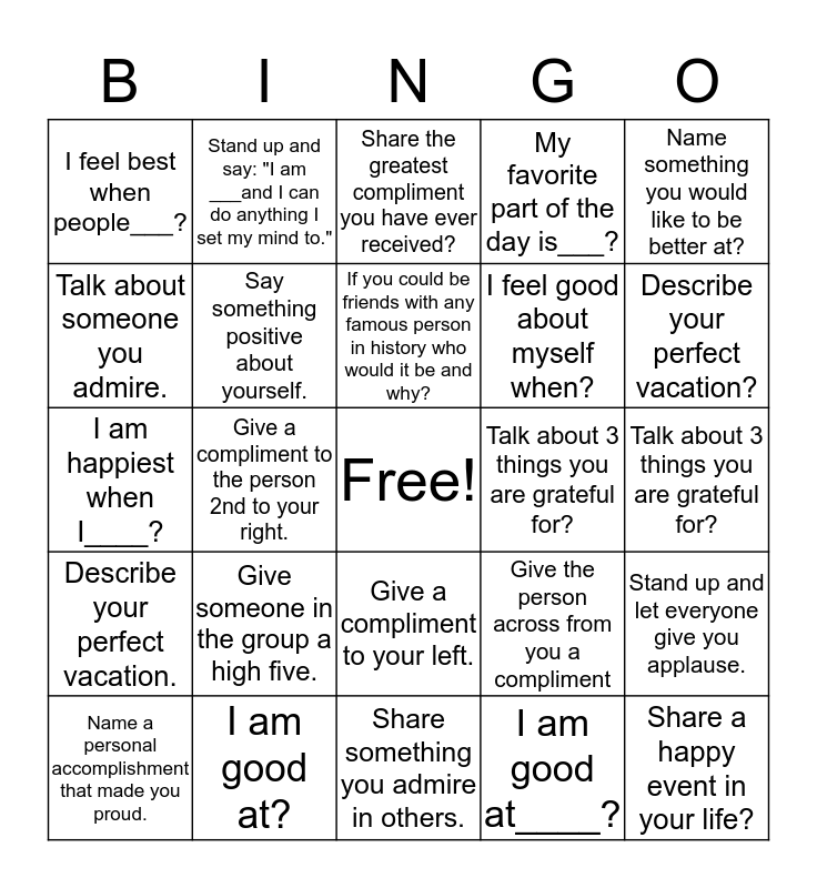 This bingo card has a free space and 24 words: Name a personal accomplishment that made you proud., Give someone in the group a high five., If you could be friends with any famous person in history who would it be and why?, I am good at____?, Name something you would like to be better at?, I feel best when people___?, Stand up and say: "I am ___and I can do anything I set my mind to.", Share the greatest compliment you have ever received?, Talk about 3 things you are grateful for?, Talk about 3 things you are grateful for?, I am happiest when I____?, Say something positive about yourself., Give the person across from you a compliment, Stand up and let everyone give you applause., Talk about someone you admire., I am good at?, Share something you admire in others., My favorite part of the day is___?, Describe your perfect vacation?, Describe your perfect vacation., Give a compliment to the person 2nd to your right., Give a compliment to your left., I feel good about myself when? and Share a happy event in your life?.