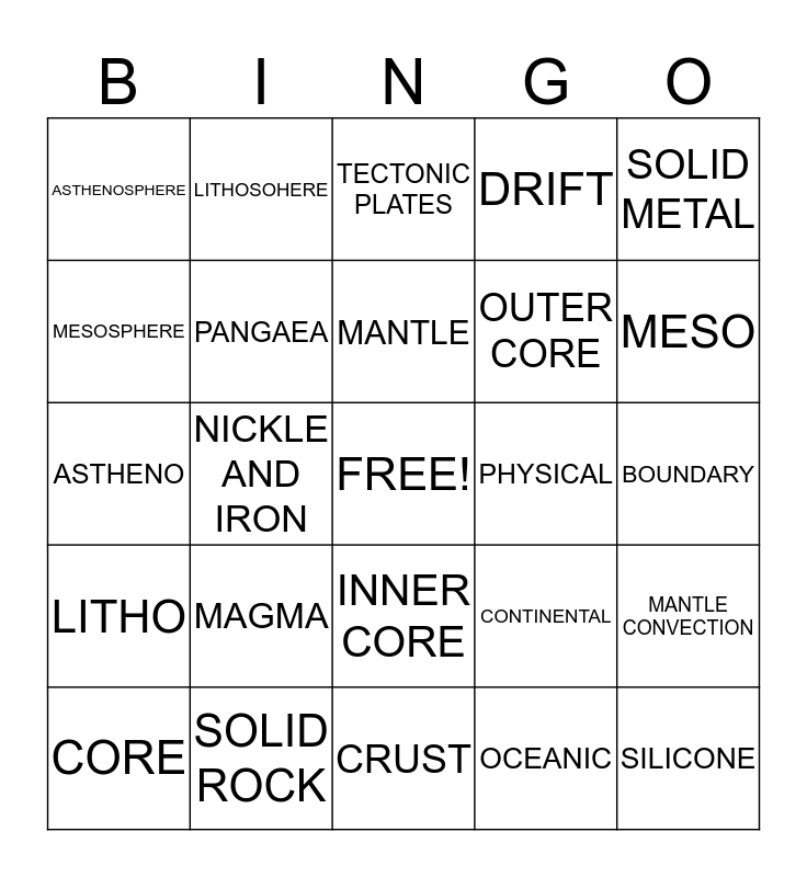 This bingo card has a free space and 24 words: MAGMA, SOLID ROCK, MANTLE, CORE, SOLID METAL, ASTHENOSPHERE, MESOSPHERE, LITHOSOHERE, PHYSICAL, INNER CORE, OUTER CORE, ASTHENO, CONTINENTAL, MANTLE CONVECTION, PANGAEA, OCEANIC, BOUNDARY, TECTONIC PLATES, MESO, NICKLE AND IRON, SILICONE, LITHO, DRIFT and CRUST.