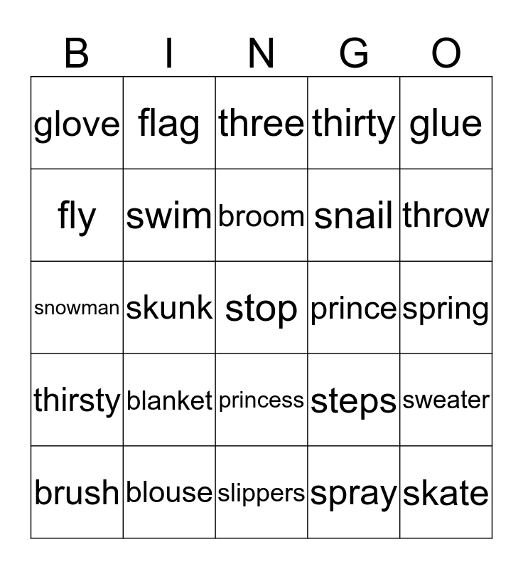 This bingo card has a free space and 24 words: blanket, blouse, broom, brush, glue, glove, fly, flag, prince, princess, snail, snowman, steps, sweater, swim, spray, spring, three, throw, skunk, skate, thirsty, thirty and slippers.