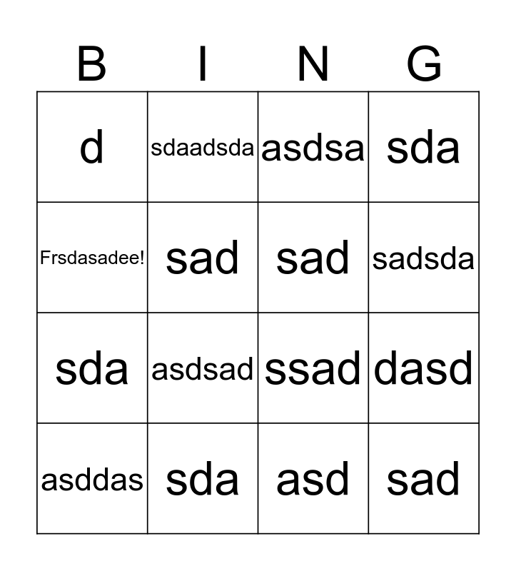 This bingo card has 16 words: sda, dasd, asdsa, d, sda, sdaadsda, ssad, asd, Frsdasadee!, sad, asddas, sda, asdsad, sadsda, sad and sad.