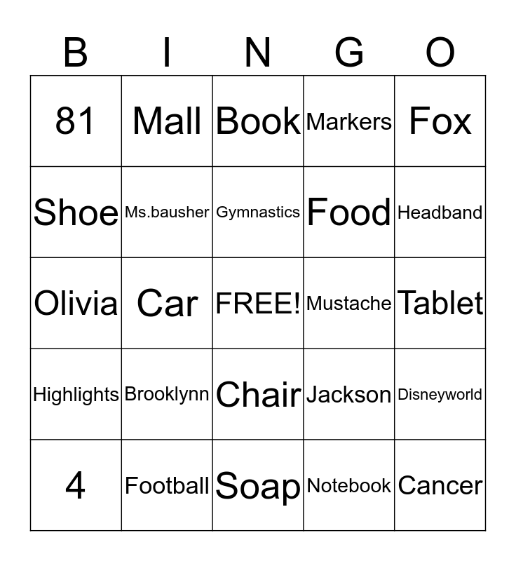 This bingo card has a free space and 24 words: Brooklynn, Football, Gymnastics, 4, Fox, 81, Shoe, Mall, Mustache, Chair, Food, Olivia, Jackson, Disneyworld, Ms.bausher, Notebook, Tablet, Book, Headband, Car, Cancer, Highlights, Markers and Soap.