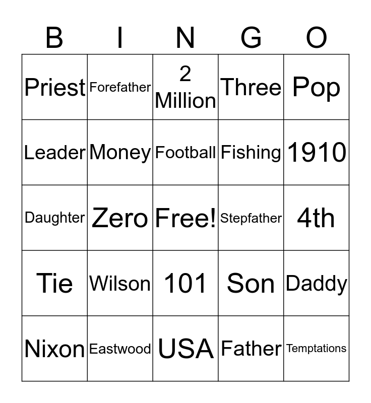 This bingo card has a free space and 25 words: Wilson, USA, Football, Nixon, Pop, Priest, Leader, Forefather, Stepfather, 101, Fishing, Daughter, Son, Daddy, Money, Rose, 4th, 2 Million, 1910, Zero, Temptations, Eastwood, Tie, Three and Father.