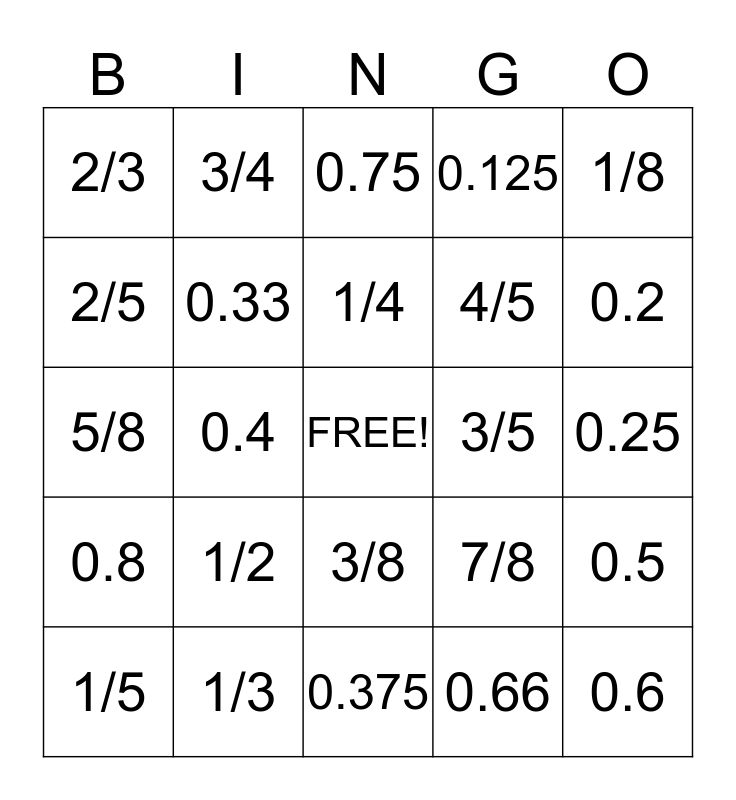 This bingo card has a free space and 24 words: 1/2, 1/3, 1/4, 1/5, 1/8, 2/3, 2/5, 3/4, 3/5, 3/8, 4/5, 5/8, 7/8, 0.5, 0.33, 0.66, 0.25, 0.75, 0.2, 0.4, 0.6, 0.8, 0.125 and 0.375.